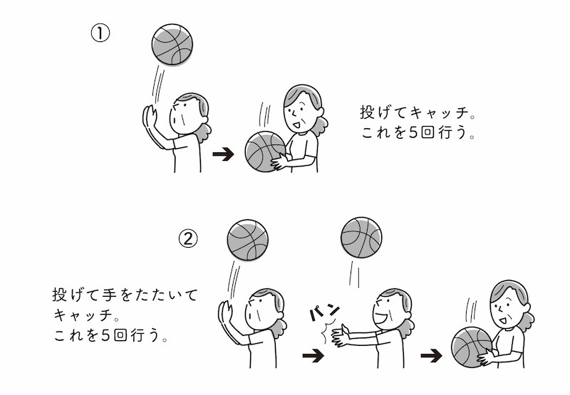 外で出来ない人は、室内でも、座りながら頭の上に投げてキャッチする方法で良く、