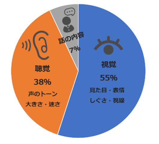 視覚・・・見た目、表情、しぐさ、視線で55%