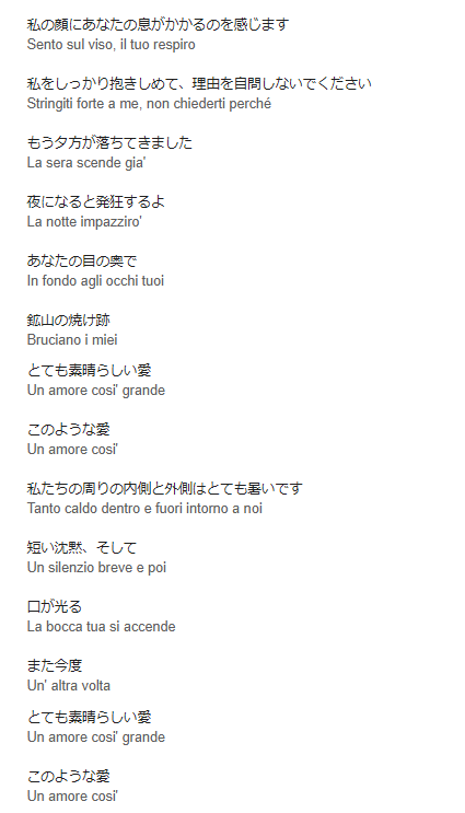イタリアの歌は、国民性がオープンでしょうか?とてもエッチな表現 4行目など「夜になると発狂するよ}とダイレクト過ぎる言葉に驚かされます。