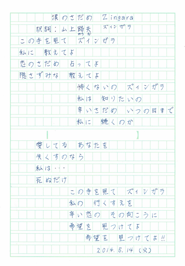 高田恭子さんが歌っている涙のさだめ ズィンガラを、昨日の歌と聞きくらべるのも楽しいですね。